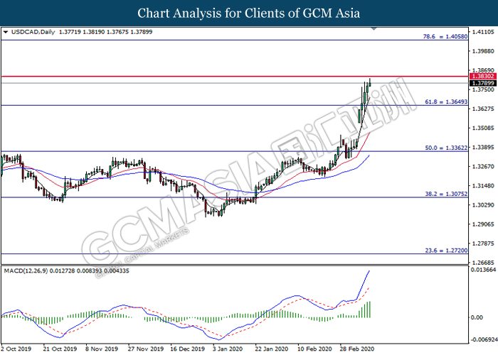 USDCAD, Daily: USDCAD was traded higher following prior breakout above the previous resistance level at 1.3650. MACD which illustrated bullish momentum suggest the pair to extend its gains toward the resistance level at 1.3830.
