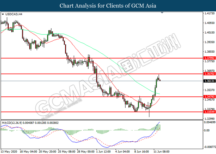 USDCAD, H4: USDCAD was traded higher while currently testing the resistance level at 1.3670. However, MACD which illustrated diminishing bullish momentum suggest the pair to be traded lower in short-term as technical correction.