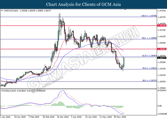USDCAD, Daily: USDCAD was traded higher while currently testing the resistance level at 1.3650. MACD which illustrates diminishing bearish momentum suggest the pair to extend its gains after it successfully breakout above the resistance level at 1.3650.