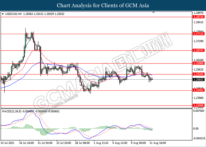 USDCAD, H4: USDCAD was traded lower following prior retracement from the resistance level 1.2535. MACD which illustrate bearish momentum signal suggest the pair to extend its losses towards the support level 1.2440.