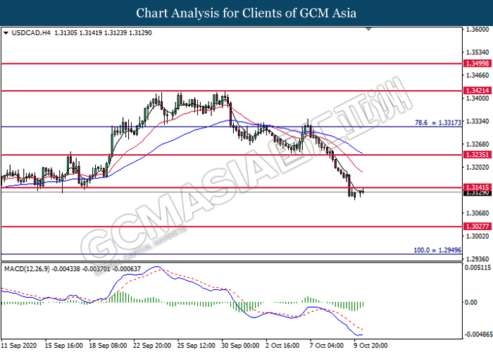 USDCAD, H4: USDCAD was traded higher following prior rebound from the lower level. MACD which illustrate diminishing bearish momentum signal suggest the pair to extend its gains after it successfully breakout above the resistance level at 1.3140.