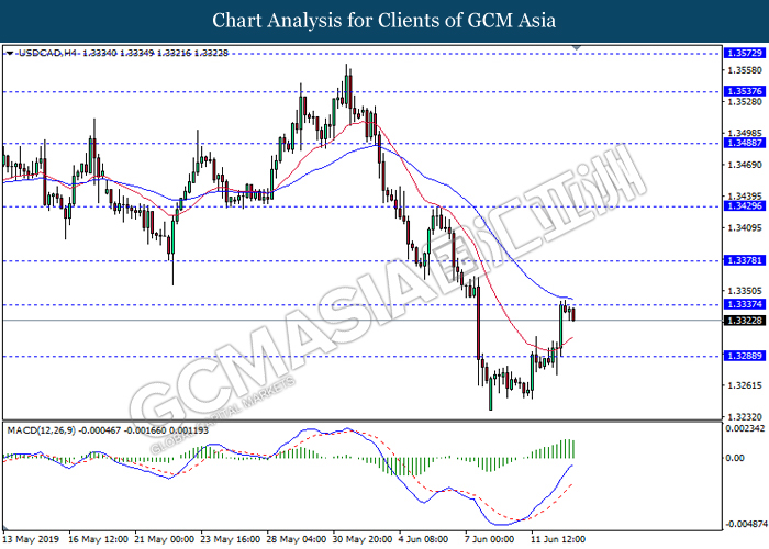 USDCAD, H4: USDCAD was traded lower following prior retracement from the resistance level 1.3335. MACD which illustrate diminishing bullish momentum suggest the pair to extend its retracement towards the support level 1.3290.