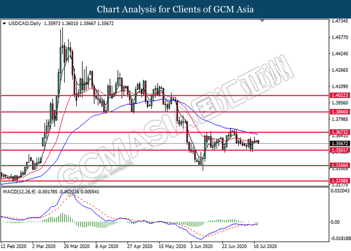 USDCAD, Daily: USDCAD was traded higher following prior rebound from the support level at 1.3500. MACD which illustrate bullish bias momentum signal suggest the pair to extend its gains toward the resistance level at 1.3675.