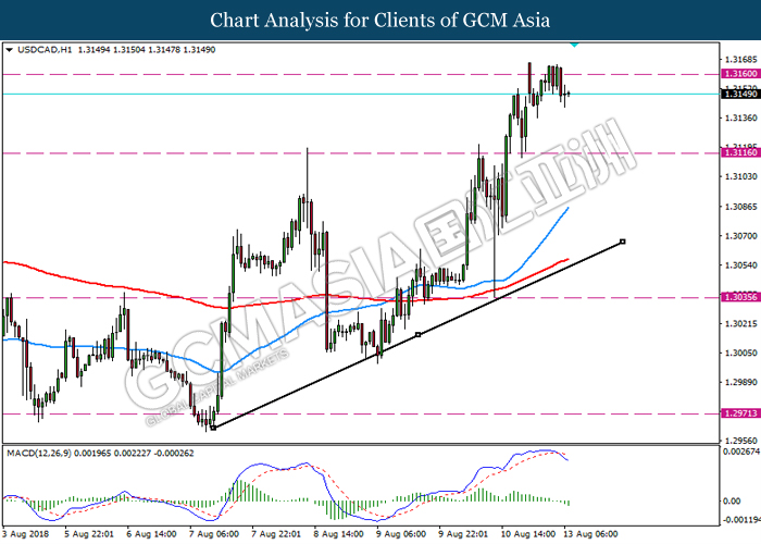 USDCAD, H1: USDCAD was traded lower following prior retracement from resistance level 1.3160. Recent price action and MACD which illustrate ongoing bearish momentum with the formation of death cross suggest the pair to be traded lower as a short term technical correction towards support level 1.3115.