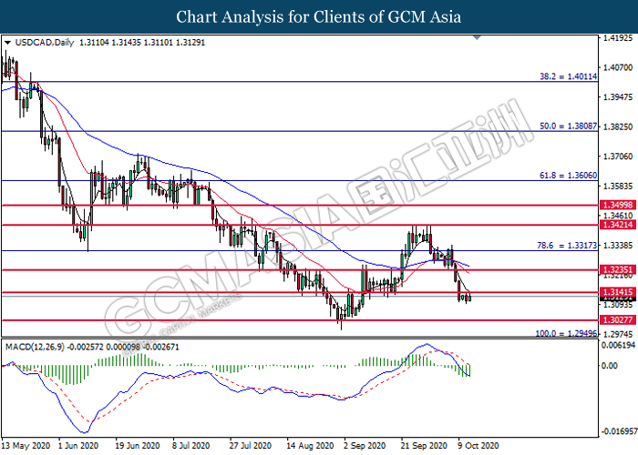 USDCAD, Daily: USDCAD was traded lower following prior breakout below the previous support level at 1.3140. MACD which illustrate bearish bias momentum signal suggest the pair to extend its losses toward the support level at 1.3025.