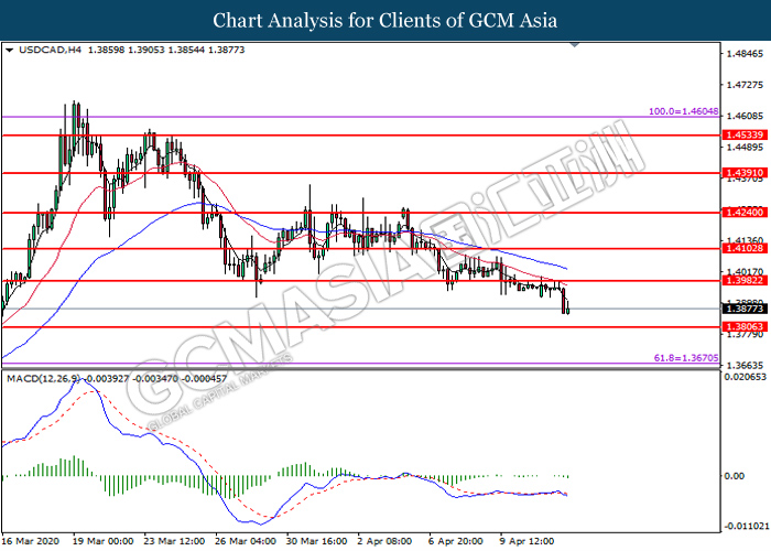 USDCAD, H4: USDCAD was traded lower following prior breakout below the previous support level at 1.3980. MACD which illustrate bearish bias momentum suggest the pair to extend its losses toward the support level at 1.3805.