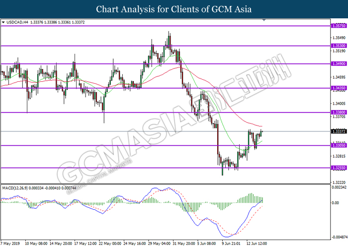 USDCAD, H4: USDCAD was traded higher following prior rebound from the support level 1.3305. MACD which illustrate ongoing bullish momentum suggest the pair to extend its rebound towards the resistance level 1.3380.