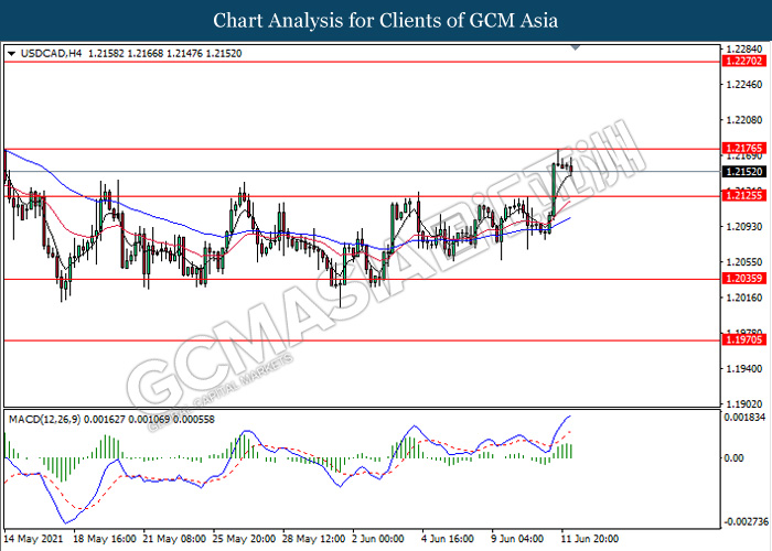 USDCAD, H4: USDCAD was traded lower following prior retracement from the resistance level 1.2175. MACD which illustrate diminishing bullish momentum signal suggest the pair to extend its retracement towards the support level 1.2125.