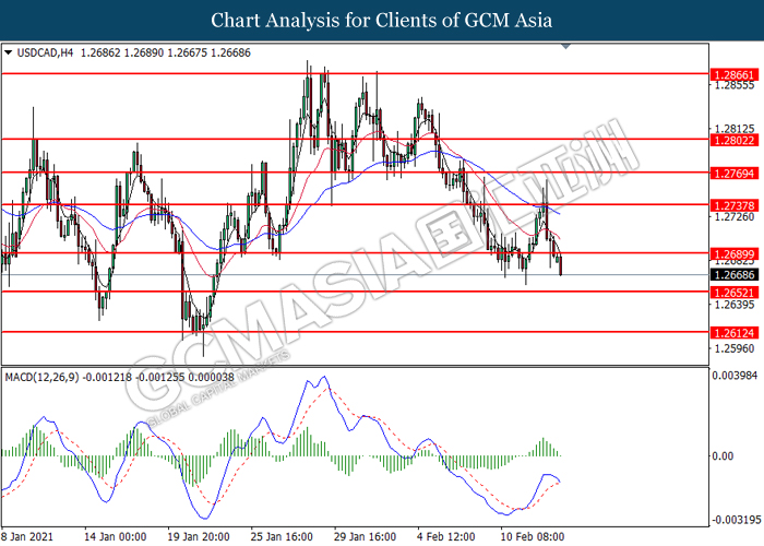 USDCAD, H4: USDCAD was traded lower following prior breakout below the previous support level at 1.2690. MACD which illustrate diminishing bullish momentum signal suggest the pair to extend its losses toward the support level at 1.2650.