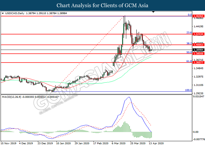 USDCAD, Daily: USDCAD was traded lower following prior breakout below the previous support level at 1.4005. However, MACD which illustrated diminishing bearish momentum suggest the pair to be traded higher in short-term as technical correction.