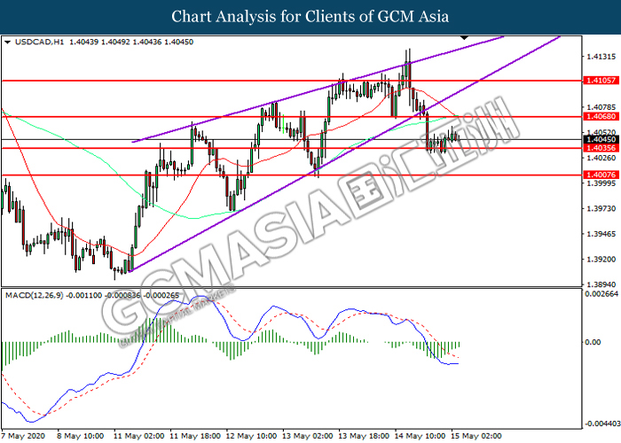 USDCAD, H1: USDCAD was traded higher following prior rebound from the support level at 1.4035. MACD which illustrated diminishing bearish momentum suggest the pair to extend its gains toward resistance level at 1.4070.