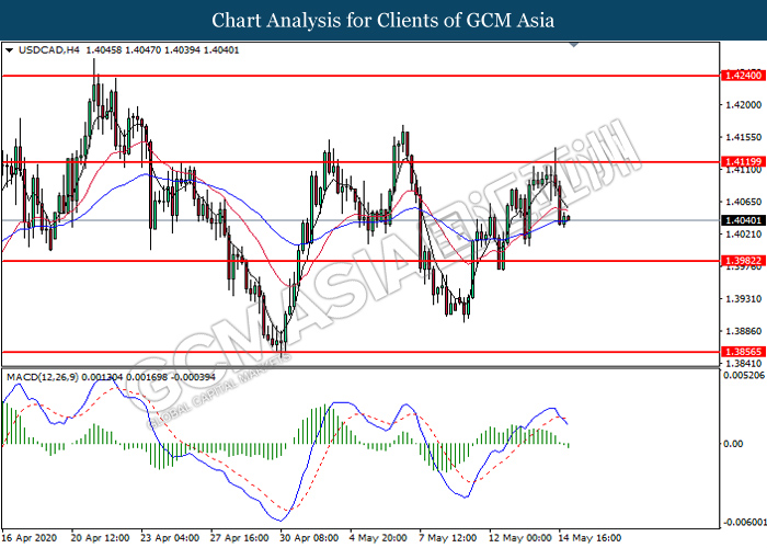 USDCAD, H4: USDCAD was traded lower following prior retracement from the resistance level at 1.4120. MACD which illustrates bearish bias momentum suggest the pair to extend its losses toward the support level at 1.3980.