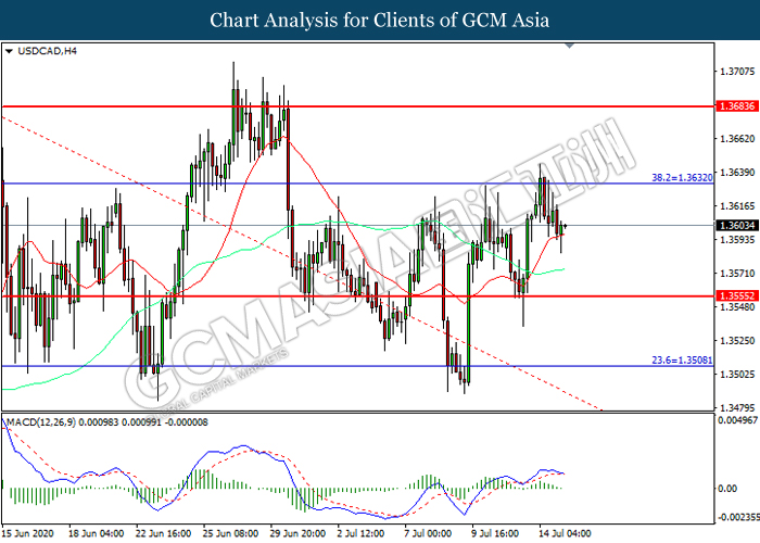 USDCAD, H4: USDCAD was traded lower following prior retracement from the resistance level at 1.3630. MACD which illustrated diminishing bullish momentum suggest the pair to extend its losses toward support level at 1.3555.