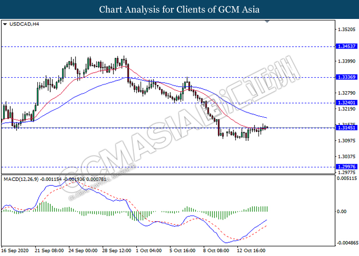 USDCAD, H4: USDCAD was traded flat while currently testing the resistance level 1.3145. However, MACD which illustrate bullish momentum signal with the recent formation of golden cross suggest the pair to be traded higher after it breaks above the resistance level.