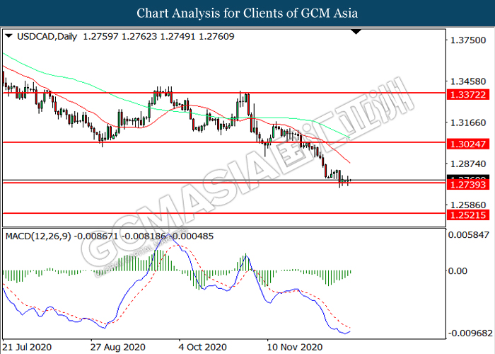 USDCAD, Daily: USDCAD was traded lower while currently testing the support level at 1.2740. However, MACD which illustrated diminishing bearish momentum suggest the pair to be traded higher in short-term as technical correction.