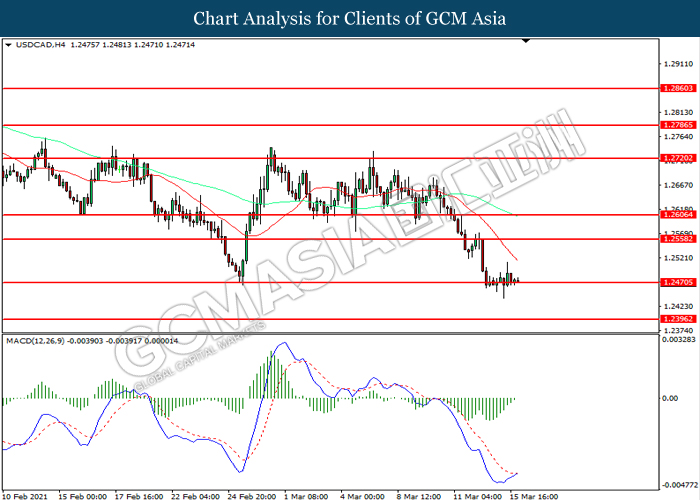 USDCAD, H4: USDCAD was traded lower while currently testing the support level at 1.2470. However, MACD which illustrated diminishing bearish momentum suggest the pair to be traded higher in short-term as technical correction.