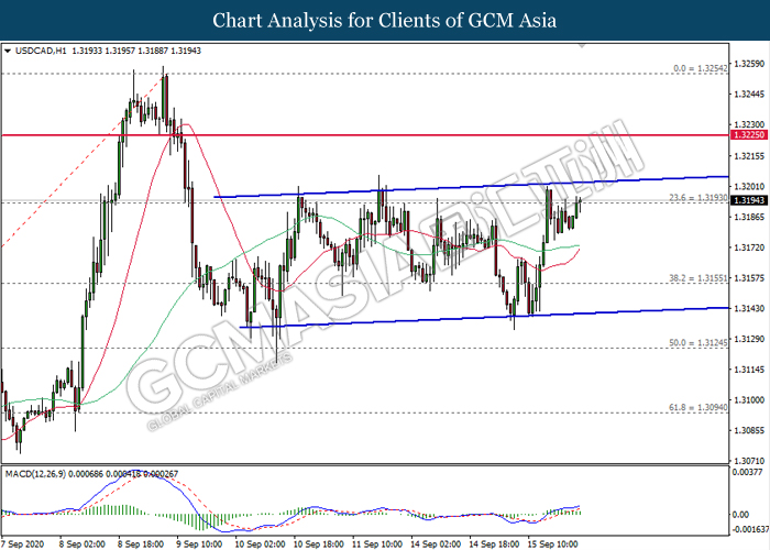 USDCAD, H1: USDCAD was traded higher following prior rebound from the lower level. MACD which illustrate bullish signal suggests the pair to extend its gains after breaking the top level of upward channel.