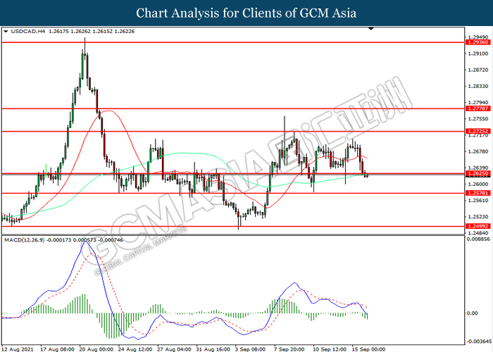 USDCAD, H4: USDCAD was traded lower while currently testing the support level at 1.2625. MACD which illustrated increasing bearish momentum suggest the pair to extend its losses after it successfully breakout below the support level.