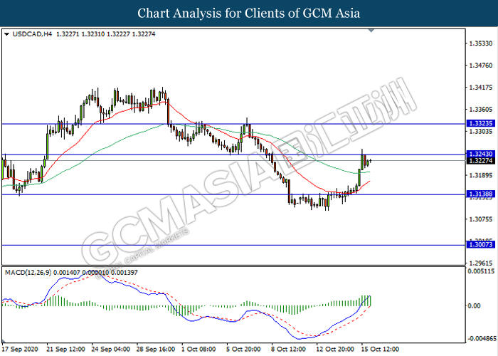 USDCAD, H4: USDCAD was traded higher while currently testing the resistance level 1.3245. MACD which illustrate ongoing bullish momentum signal suggest the pair to extend its gains after it breaks above the resistance level.