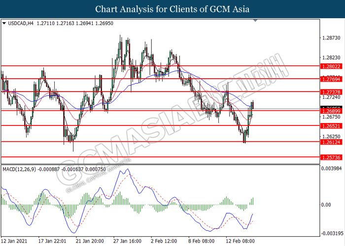 USDCAD, H4: USDCAD was traded higher following prior breakout above the previous resistance level at 1.2690. MACD which illustrate bullish bias momentum signal suggest the pair to extend its gains toward the resistance level at 1.2740.