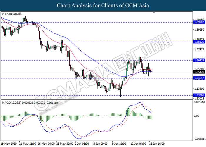 USDCAD, H4: USDCAD was traded lower while currently testing near the support level 1.3485. MACD which illustrate bearish momentum signal suggest the pair to extend its losses after it breaks below the support level.