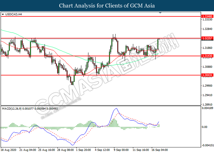 USDCAD, H4: USDCAD was traded higher while currently testing the resistance level at 1.3235. MACD which illustrated increasing bullish momentum suggest the pair to extend its gains after it successfully breakout above the resistance level.