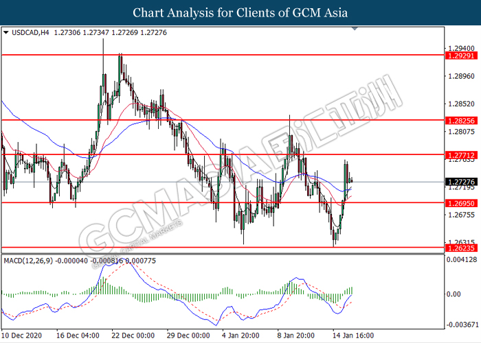 USDCAD, H4: USDCAD was traded lower following prior retracement from the resistance level at 1.2770. MACD which illustrate diminishing bullish momentum suggest the pair to extend its losses toward the support level at 1.2695.