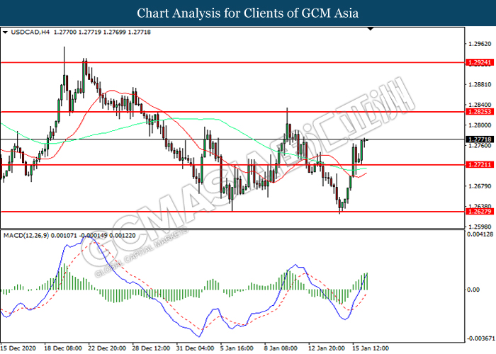 USDCAD, H4: USDCAD was traded higher following prior rebound from the support level at 1.2720. MACD which illustrated increasing bullish momentum suggest the pair to extend its gains toward resistance level at 1.2825.