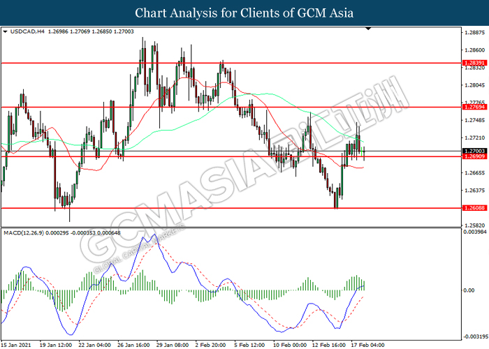USDCAD, H4: USDCAD was traded lower while currently testing the support level at 1.2690. MACD which illustrated diminishing bullish momentum suggest the pair to extend its losses after it successfully breakout below the support level.