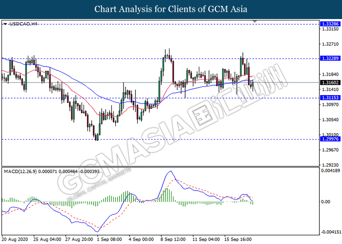 USDCAD, H4: USDCAD was traded lower following recent retracement from the resistance level 1.3230. MACD which illustrate bearish momentum signal suggest the pair to extend its losses towards the support level 1.3115.