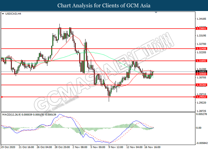 USDCAD, H4: USDCAD was traded higher following prior rebound from the support level at 1.3090. MACD which illustrated diminishing bearish momentum suggest the pair to extend its gains toward resistance level at 1.3170.