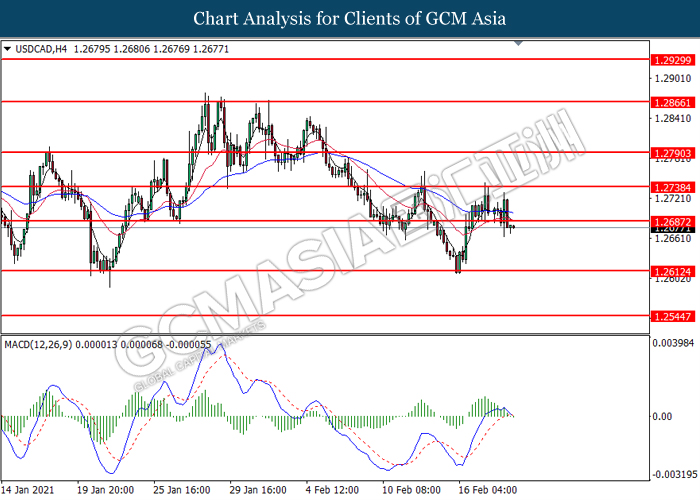 USDCAD, H4: USDCAD was traded lower following prior breakout below the previous support level at 1.2685. MACD which illustrate diminishing bullish momentum signal suggest the pair to extend its losses toward the support level at 1.2610.