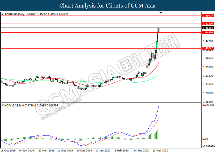 USDCAD, Daily: USDCAD was traded higher following prior breakout above the previous resistance level at 1.4495. MACD which illustrated increasing bullish momentum suggest the pair to extend its gains toward resistance level at 1.4730.