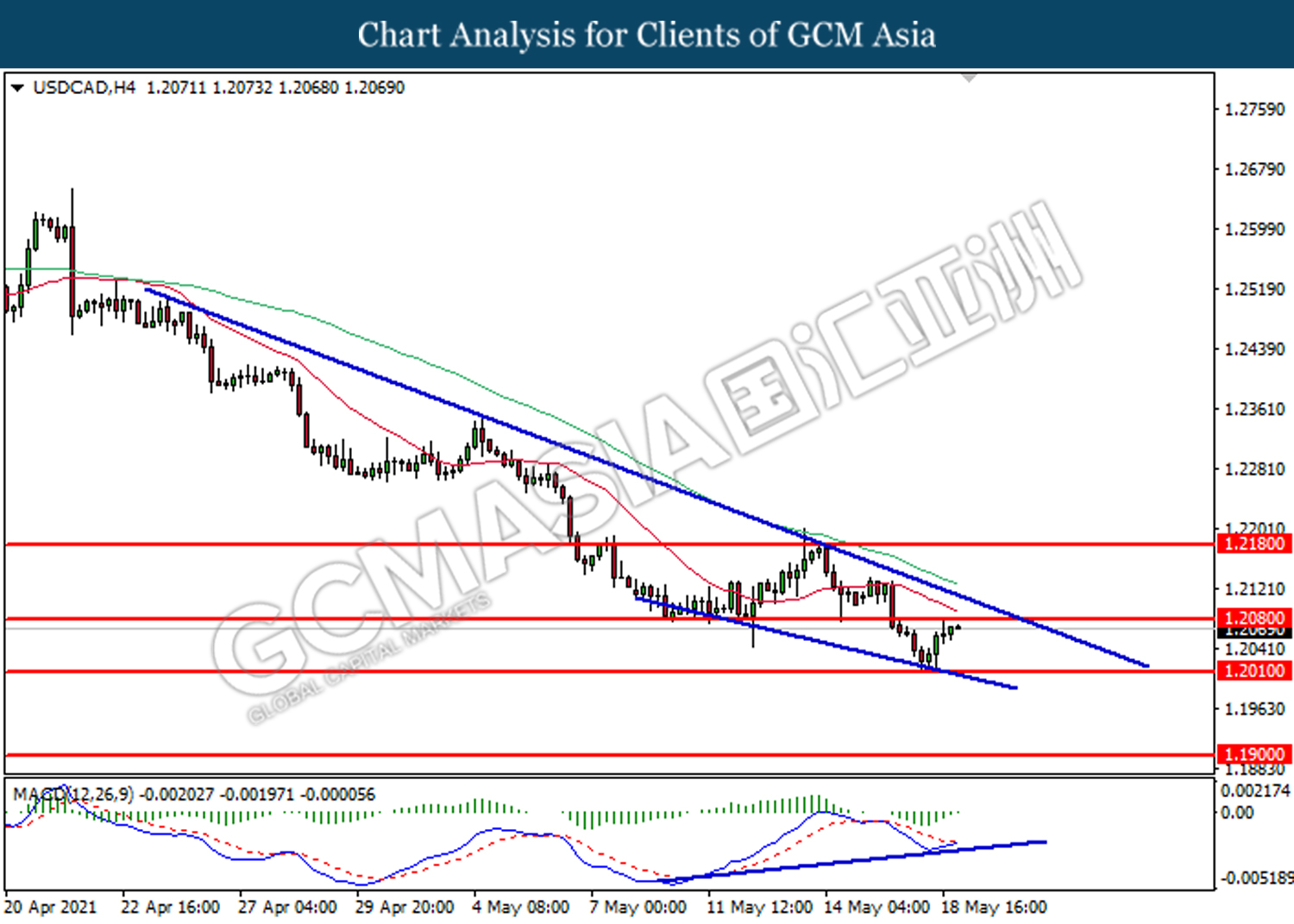 USDCAD, H4: USDCAD was higher following prior rebound from lower level. MACD which illustrate bullish divergence signal suggests the pair to be traded higher in short-term.