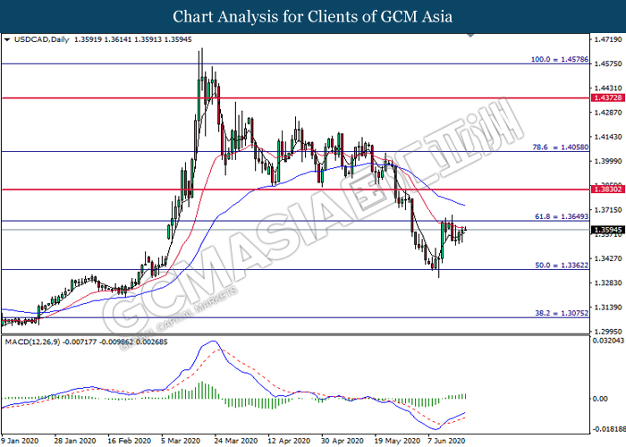 USDCAD, Daily: USDCAD was traded higher following prior rebound from the lower level. MACD which illustrate bullish bias momentum signal suggest the pair to extend its gains toward the resistance level at 1.3650.