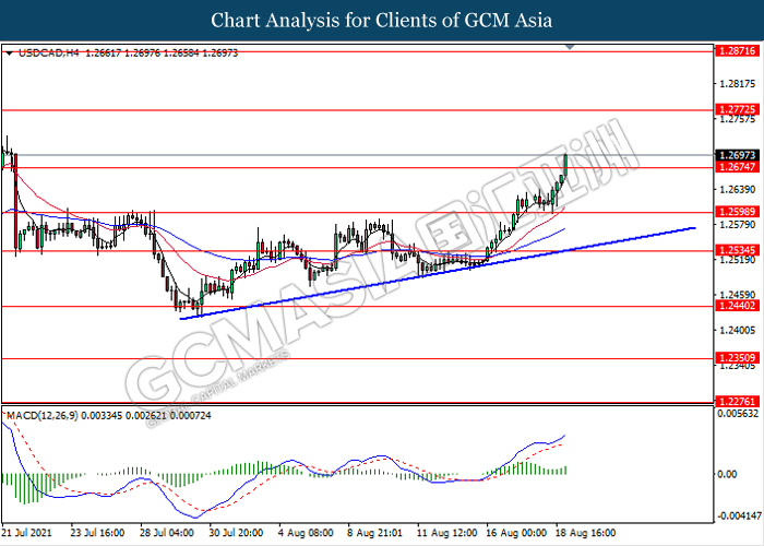 USDCAD, H4: USDCAD was traded higher following prior breakout above the previous resistance level 1.2675. MACD which illustrate ongoing bullish momentum signal suggest the pair to extend its gains towards the resistance level 1.2770.
