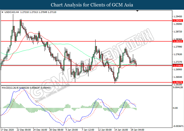 USDCAD, H4: USDCAD was traded lower while currently testing the support level at 1.2710. MACD which illustrated increasing bearish momentum suggest the pair to extend its losses after it successfully breakout below the support level.