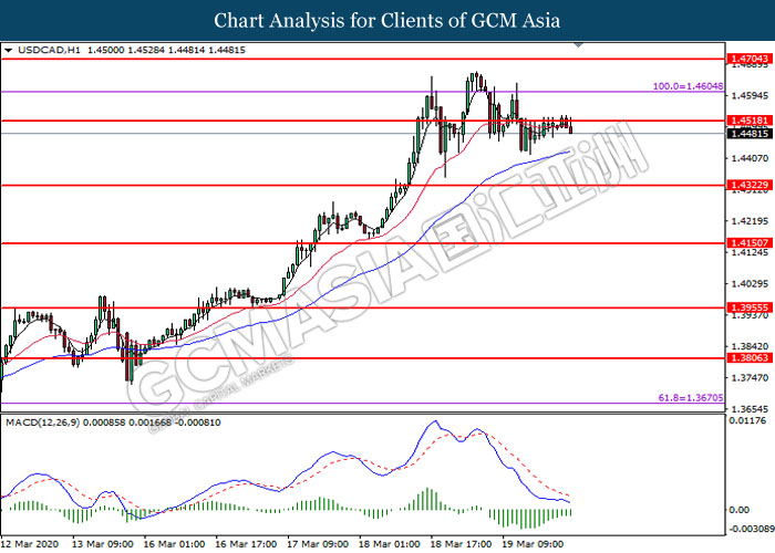 USDCAD, H1: USDCAD was traded lower following prior retracement from the resistance level at 1.4520. MACD which illustrate bearish bias momentum signal suggest the pair to extend its losses toward the support level at 1.4325.