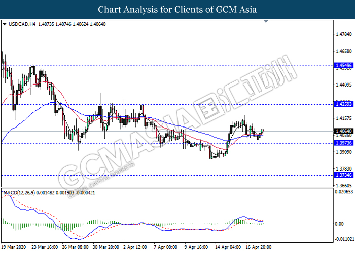 USDCAD, H4: USDCAD was traded higher following prior rebound from the support level 1.3975. MACD which illustrate diminishing bearish momentum suggest the pair to extend its rebound towards the resistance level 1.4260.
