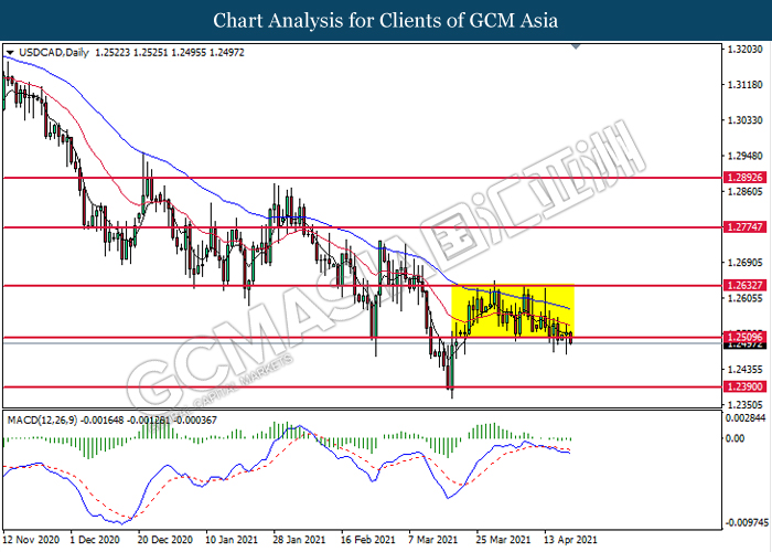 USDCAD, H4: USDCAD was traded lower while currently testing the support level at 1.2510. MACD which illustrated bearish bias momentum suggest the pair to extend its losses after it successfully breakout below the support level at 1.2510.