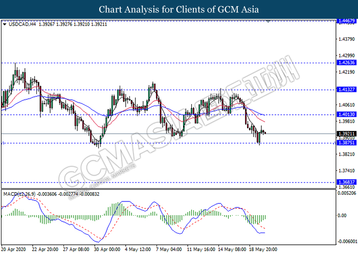 USDCAD, H4: USDCAD was traded higher following prior rebound from the support level 1.3875. MACD which illustrate diminishing bearish momentum signal suggest the pair to extend its rebound towards the resistance level 1.4015.