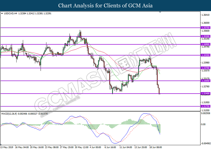USDCAD, H4: USDCAD was traded lower while currently testing the support level 1.3240. MACD which display persistent bearish momentum suggest the pair to extend its losses after successfully breaking below the support level.