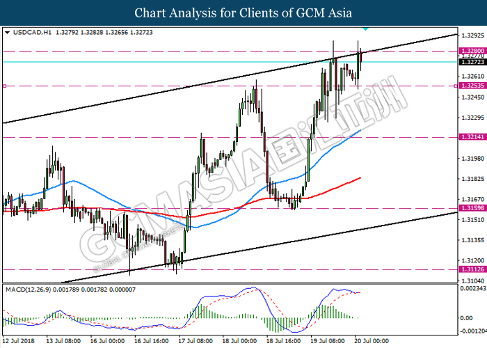 USDCAD, H1: USDCAD was traded higher while currently testing the top level of the ascending channel. Price action and MACD which illustrate diminished bearish momentum with negative divergence pattern suggest the pair may experience a short term technical correction towards the support level 1.3260.