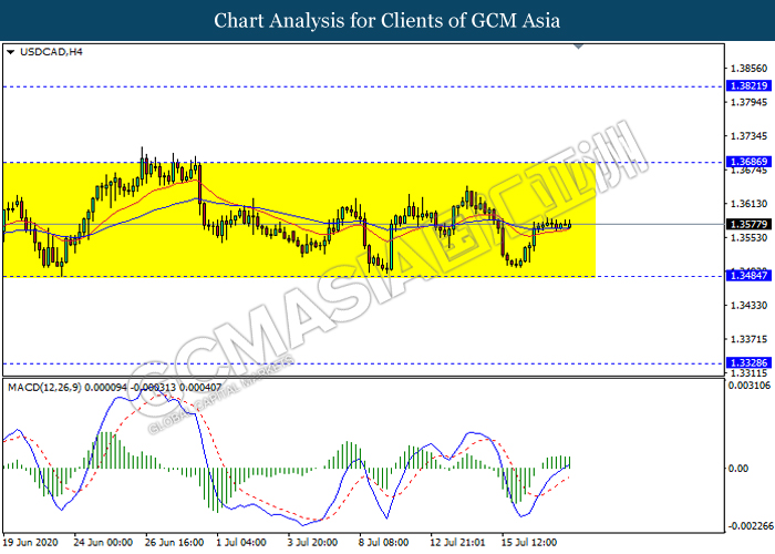 USDCAD, H4: USDCAD remain traded flat in a sideway channel. However, MACD which display bullish momentum signal suggest the pair to be traded higher towards the resistance level 1.3685.