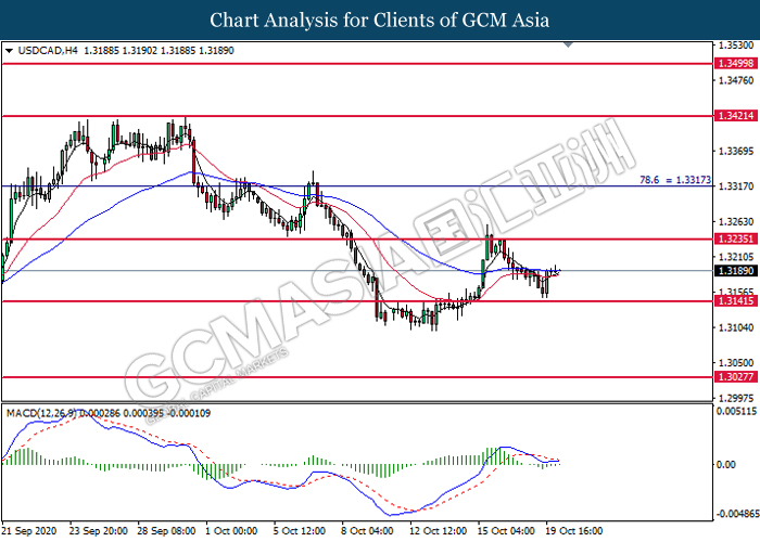 USDCAD, H4: USDCAD was traded higher following prior rebound from the support level at 1.3140. MACD which illustrate diminishing bearish momentum signal suggest the pair to extend its gains toward the resistance level at 1.3235.