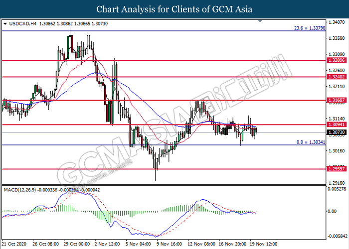 USDCAD, H4: USDCAD was traded lower following prior retracement from the resistance level at 1.3095. MACD which illustrate bearish bias momentum signal suggest the pair to extend its losses toward the support level at 1.3035.