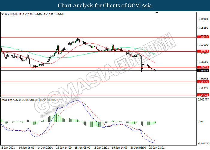 USDCAD, H1: USDCAD was traded lower following prior breakout below the previous support level at 1.2630. However, MACD which illustrated diminishing bearish momentum suggest the pair to be traded higher in short-term as technical correction.