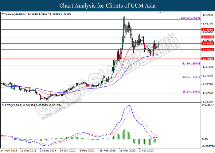 USDCAD, Daily: USDCAD was traded higher while currently testing the resistance level at 1.4105. MACD which illustrate diminishing bearish momentum suggest the pair to extend its gains after it successfully breakout above the resistance level at 1.4105.