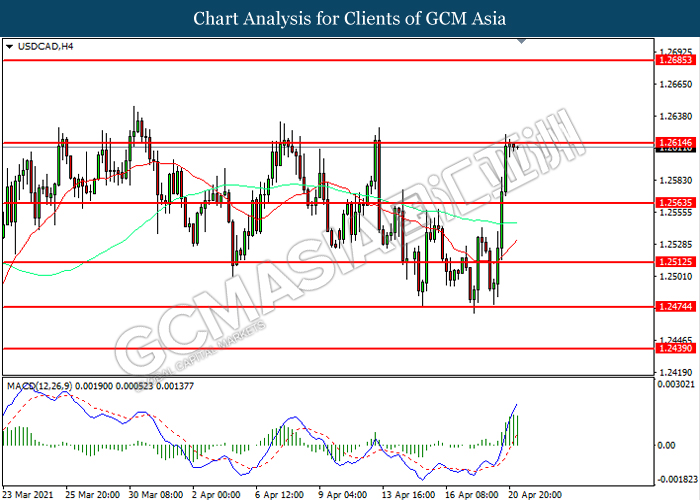 USDCAD, H4: USDCAD was traded higher while currently testing the resistance level at 1.2615. MACD which illustrated increasing bullish momentum suggest the pair to extend its gains after it successfully breakout above the resistance level.