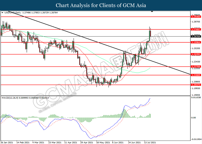USDCAD, Daily: USDCAD was traded lower following prior retracement from the resistance level at 1.2770. MACD which illustrated diminishing bullish momentum suggest the pair to extend its losses toward support level at 1.2595.